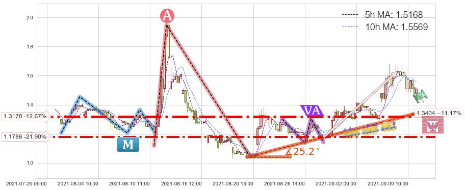 ♘ 在最后的上升阶段2021-08-20 10:00至2021-09-09 12:00存在 持续未破位的支撑位 ,支撑价格1.3404,支撑可信任强度69.15%,其距离最后价格1.5090相差 -11.17%