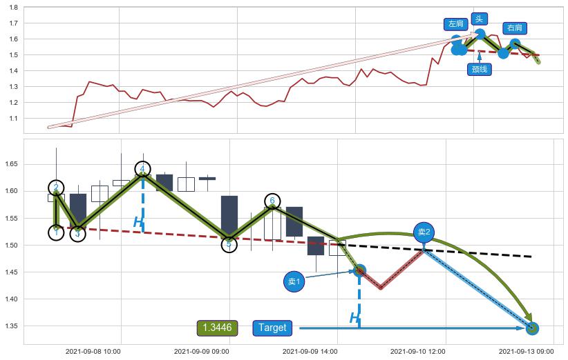 ➣ 【未确认突破,预测即将形成突破】头肩顶起点:09-03:13, 预测突破点:09-09:15,形态共21交易小时