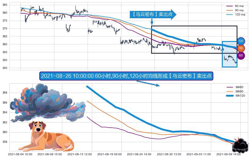 ⚀ 2021-08-12 15:00:00小时-2021-09-09 14:00:00小时显现 60小时-90小时-120小时均线 【乌云密布】卖出点 看空信号,后市看跌,卖出