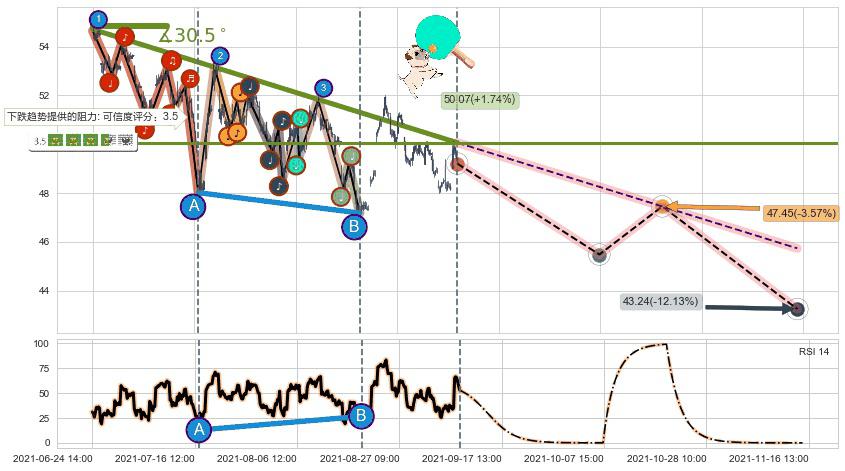 ➣ 预测:2021-10-20 13:00,【试探阻力】稳定目前下跌趋势的前提下,预测价格:47.45