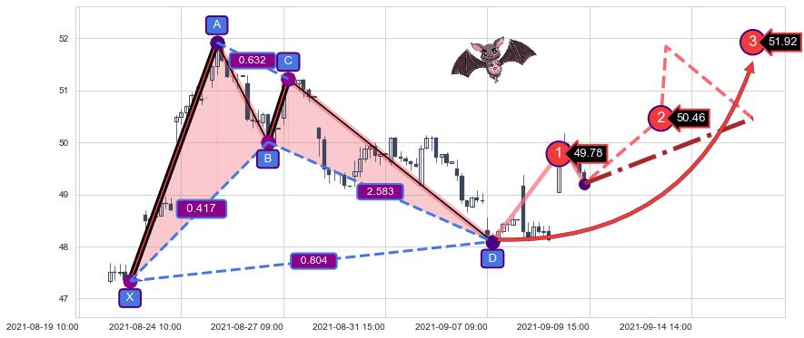➣ 已完成【蝙蝠】形态起点X: 08-20:13, 终点D: 09-07:10, 共72交易小时
