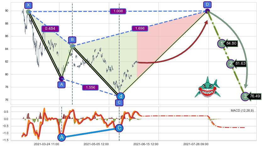 ➢ 距离预测D点位置尚有上涨空间,短线依然【看涨】, 耐心等待看跌【鲨鱼】形态反转启动