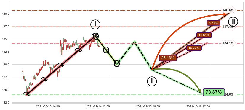 ➢ 循环浪继续向上【最低】位置(10-18:14, 134.15),匹配聚类样本比例41.04%, 可能性概率10.72%