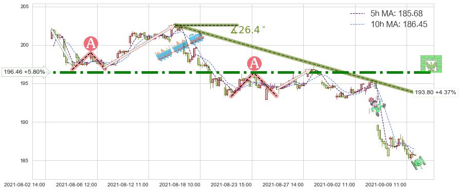 2021-08-30: 第一阻力位196.46强力阻拦了上升趋势,成功阻止了价格的继续上涨。