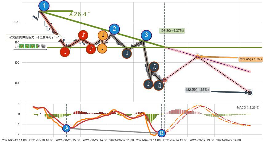➣ 预测:2021-09-23 15:00,【继续下探】稳定目前下跌趋势的前提下,预测价格:182.59