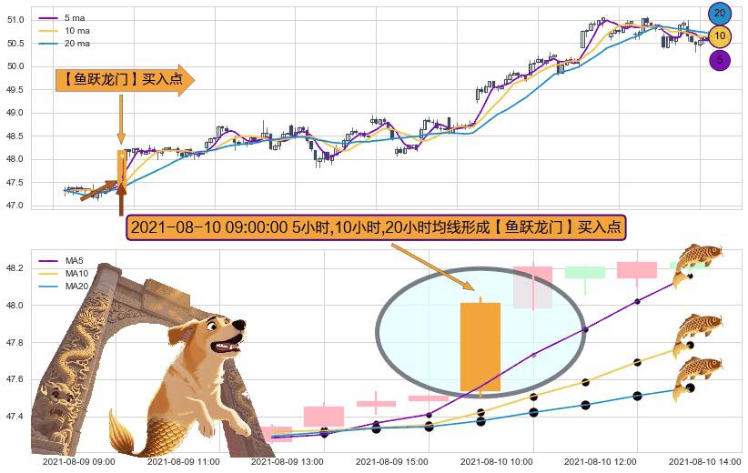 ⚀ 2021-08-10 09:00:00小时显现 5小时-10小时-20小时均线 【鱼跃龙门】买入点 看多信号,后市看涨,买入