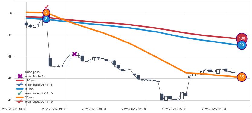 ⚀ 2021-09-03 14:00:00-小时显现 葛兰威尔均线 120小时均线 第⑤卖出点 上升趋势均值回复的短线回落信号,后市看跌,卖出信号