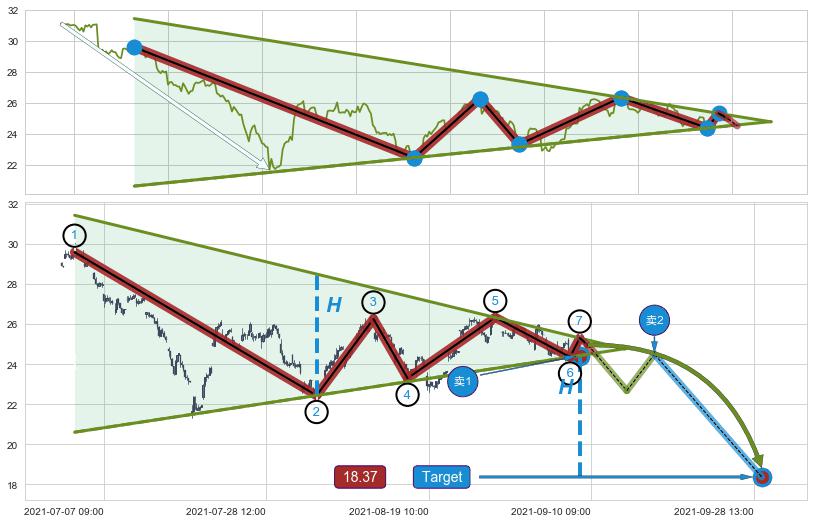 从2021-06-23 09:00至2021-08-06 12:00,共包含203个小时,阶段股价下跌-21.05%,阶段股价变动位移路程比: 1 : 8,下跌趋势角度: 64.3