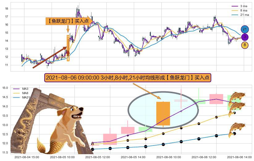 ⚀ 2021-08-06 09:00:00小时显现 3小时-8小时-21小时均线 【鱼跃龙门】买入点 看多信号,后市看涨,买入