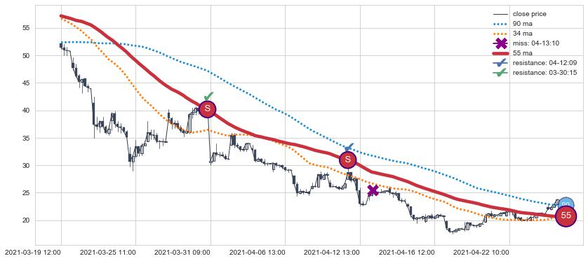 ⚀ 中期均线MA21下穿长期均线MA34形成的交叉是标准 死亡交叉