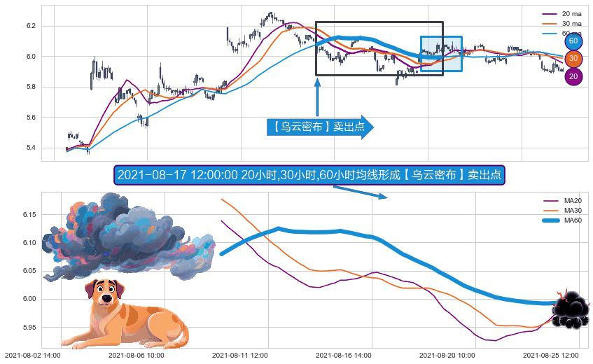 ⚀ 2021-08-10 09:00:00小时-2021-08-25 09:00:00小时显现 20小时-30小时-60小时均线 【乌云密布】卖出点 看空信号,后市看跌,卖出