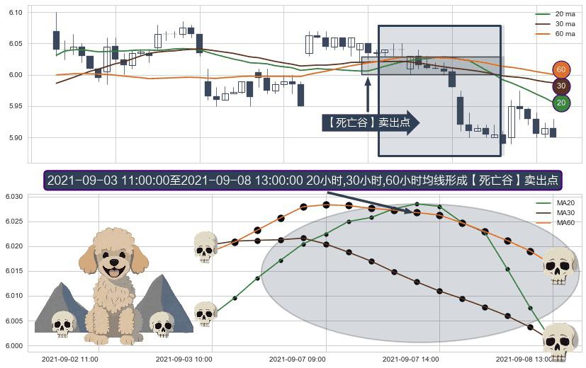⚀ 2021-09-03 12:00:00-小时至2021-09-08 13:00:00-小时显现 20小时-30小时-60小时均线 【死亡谷】卖出点 看空信号,后市看跌,卖出
