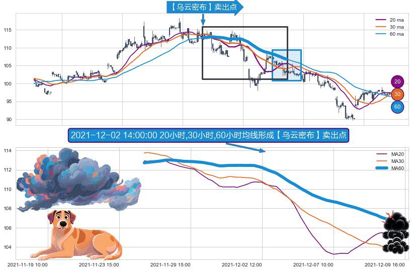 ⚀ 2021-11-24 14:00:00小时-2021-12-09 12:00:00小时显现 20小时-30小时-60小时均线 【乌云密布】卖出点 看空信号,后市看跌,卖出