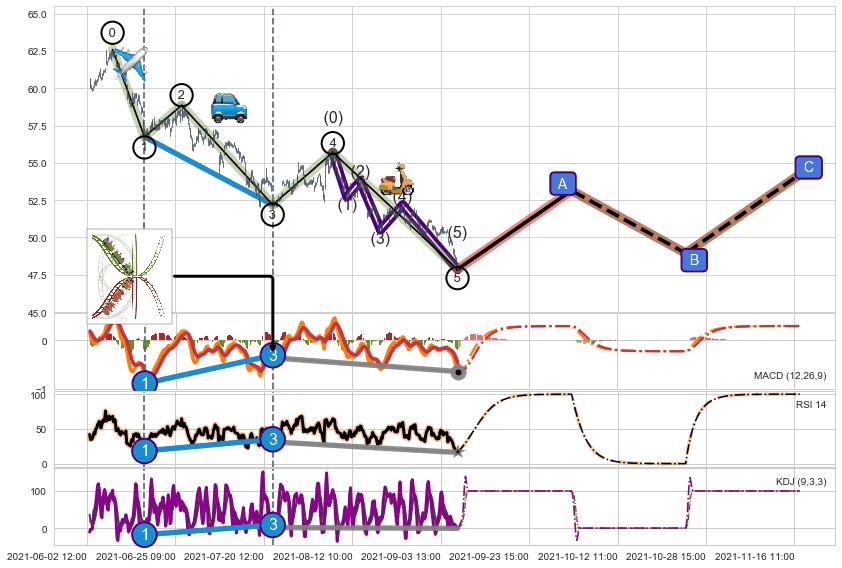 ➣ 1,3,5驱动浪MACD, RSI, KDJ走势都出现【常规背离】反转信号增强
