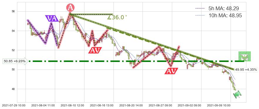 ♘ 在最后的下跌阶段2021-08-06 12:00至2021-09-09 14:00,存在 持续未破位的阻力位 ,阻力价格49.95,可信任强度82.65%,其距离最后价格47.87相差 +4.35%