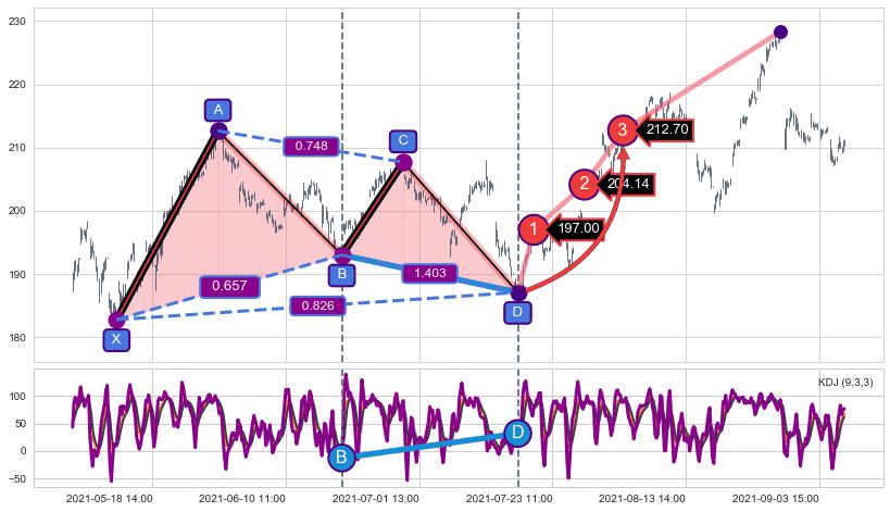 ➢ 谐波价格D点比B点低 ⤵,【KDJ】指标D点比B点高 ⤴️
