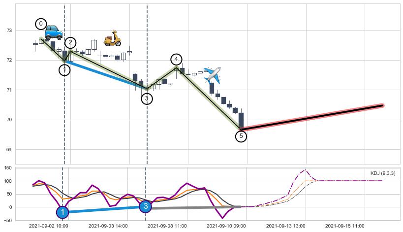 ➢ 第一, 三驱动浪端点:【KDJ】走势出现【常规背离 & 反转信号】背离程度28.47%,背离夹角角度77.4˚,背离程度较小