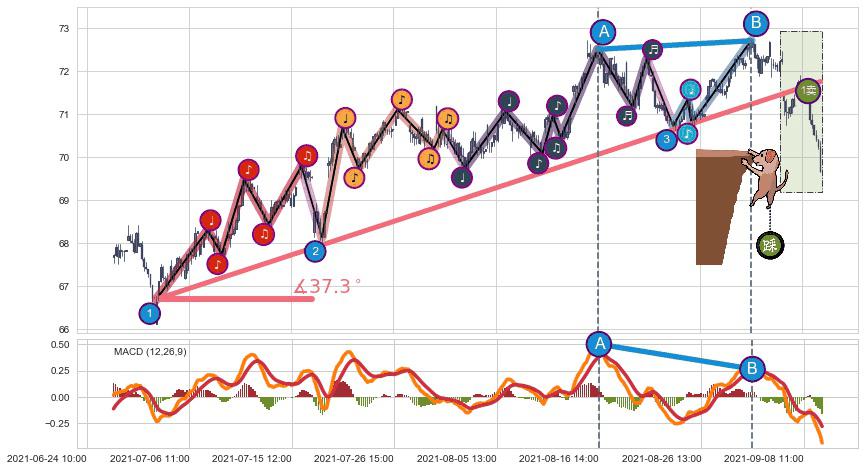 从2021-07-01 09:00至2021-09-01 14:00,共包含295个小时,阶段股价上涨8.29%,阶段股价变动位移路程比: 1 : 7,上涨趋势角度: 37.3