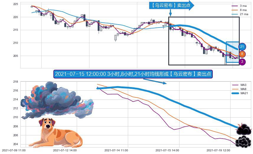 形态多维评估: ⚀ 2021-07-13 12:00:00小时-2021-07-19 14:00:00小时显现 3小时-8小时-21小时均线 【乌云密布】卖出点 看空信号,后市看跌,卖出
