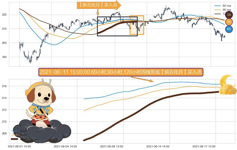 形态多维评估: ⚀ 2021-06-07 10:00:00小时-2021-06-18 10:00:00小时显现 60小时-90小时-120小时均线 【烘云托月】买入点 看多信号,后市看涨,买入