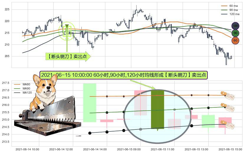 形态多维评估: ⚀ 2021-06-15 10:00:00小时显现 60小时-90小时-120小时均线 【断头铡刀】卖出点 看空信号,后市看跌,卖出