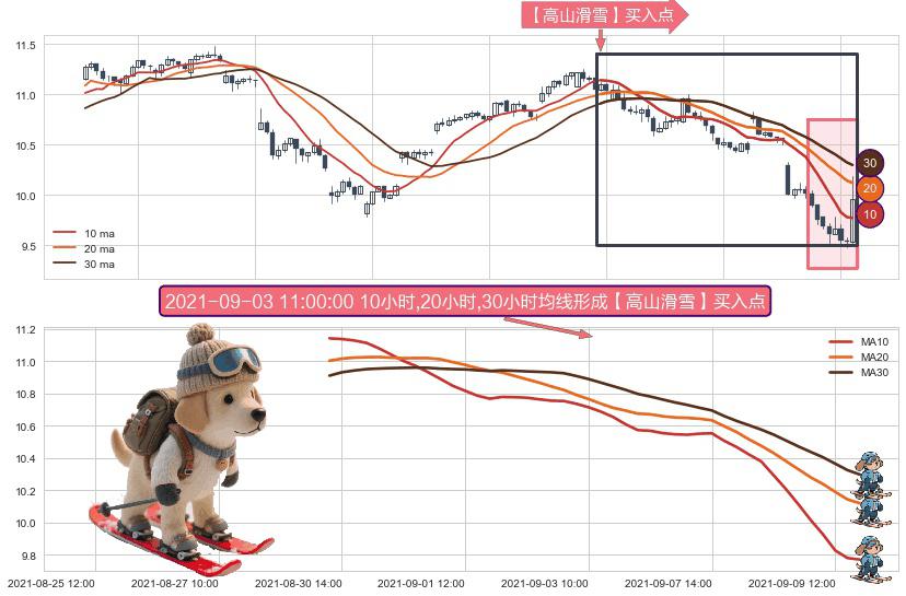 形态多维评估: ⚀ 2021-08-30 13:00:00小时-2021-09-09 14:00:00小时显现 10小时-20小时-30小时均线 【高山滑雪】买入点 看多信号,后市看涨,买入