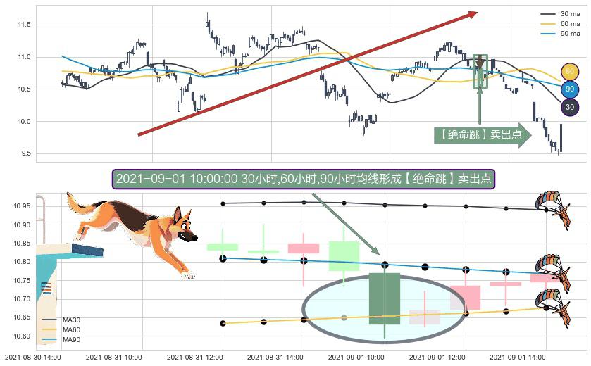形态多维评估: ⚀ 2021-09-01 10:00:00小时显现 30小时-60小时-90小时均线 【绝命跳】卖出点 看空信号,后市看跌,卖出