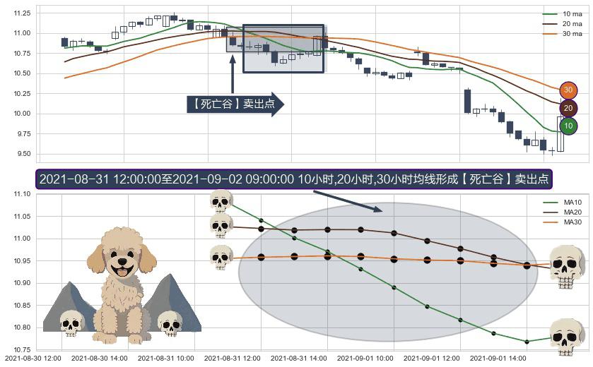 形态多维评估: ⚀ 2021-08-31 13:00:00-小时至2021-09-02 09:00:00-小时显现 10小时-20小时-30小时均线 【死亡谷】卖出点 看空信号,后市看跌,卖出