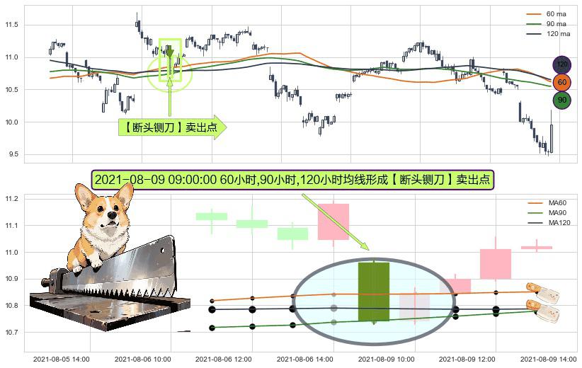 形态多维评估: ⚀ 2021-08-09 09:00:00小时显现 60小时-90小时-120小时均线 【断头铡刀】卖出点 看空信号,后市看跌,卖出