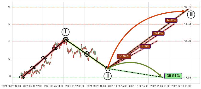 ➣ D点拟合预测价格8.43,距离最后交易收盘价格9.96相差 -15.37%