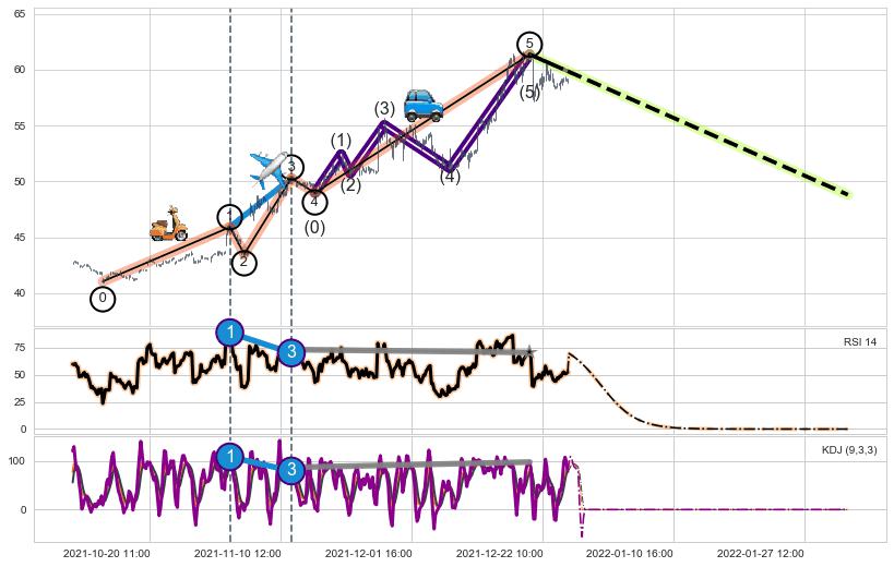 ➣ 第一, 三驱动浪端点:【KDJ】走势出现【常规背离 & 反转信号】背离程度67.65%,背离夹角角度88.4˚,背离程度较大
