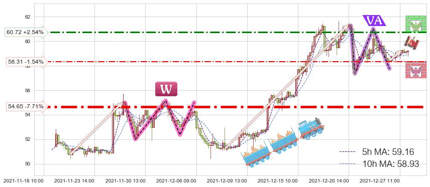 ♘ 阻力价格位60.72,可信任强度66.79%,距离最后交易2021-12-27 15:00形成的收盘价格59.22相差 +2.54%