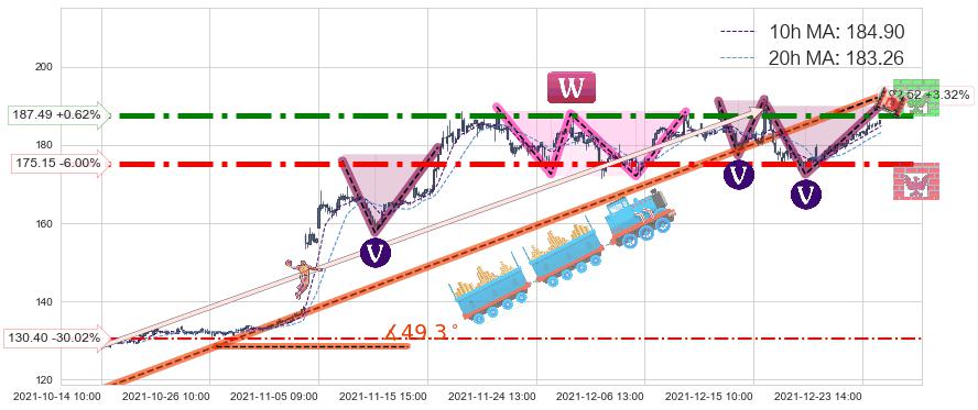 ♘ 阻力价格位187.49,可信任强度94.75%,距离最后交易2021-12-27 16:00形成的收盘价格186.33相差 +0.62%