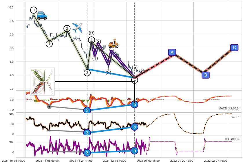 ➢ 1,3,5驱动浪MACD, RSI, KDJ走势都出现【常规背离】反转信号增强