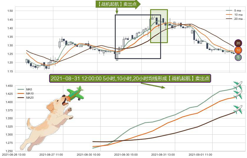 形态多维评估: ⚀ 2021-08-30 09:00:00小时-2021-09-01 14:00:00小时显现 5小时-10小时-20小时均线 【战机起航】卖出点 看空信号,后市看跌,卖出