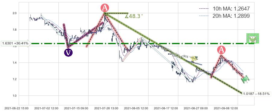 从2021-07-21 09:00至2021-08-24 09:00,共包含154个小时,阶段股价下跌-37.54%,阶段股价变动位移路程比: 1 : 5,下跌趋势角度: 48.3