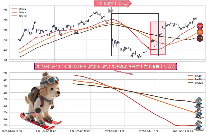 ⚀ 2021-05-03 14:00:00小时-2021-05-19 14:00:00小时显现 60小时-90小时-120小时均线 【高山滑雪】买入点 看多信号,后市看涨,买入