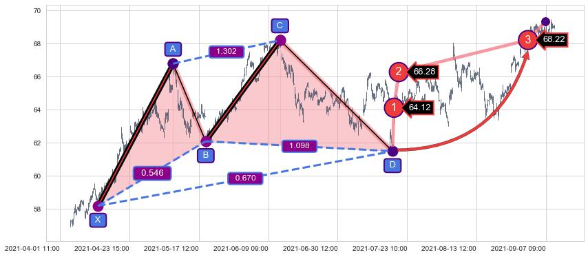 ➣ D点拟合预测价格71.41,距离最后交易收盘价格68.40相差 +4.40%
