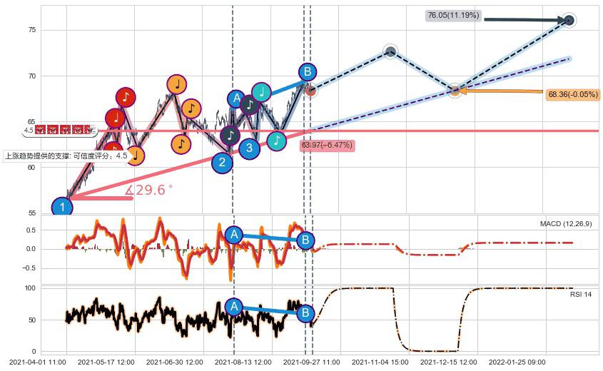 ♘ 在最后的上升阶段2021-04-05 13:00至2021-09-08 15:00存在 持续未破位的支撑位 ,支撑价格63.97,支撑可信任强度88.21%,其距离最后价格68.40相差 -6.47%
