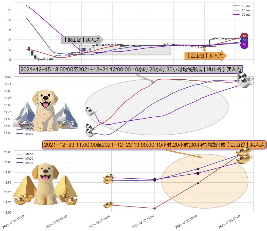 ⚃ 2021-12-23 12:00:00-小时至2021-12-23 13:00:00-小时显现 10小时-20小时-30小时均线 【金山谷】买入点 其再次确认了买入信号,可靠性更强,买入