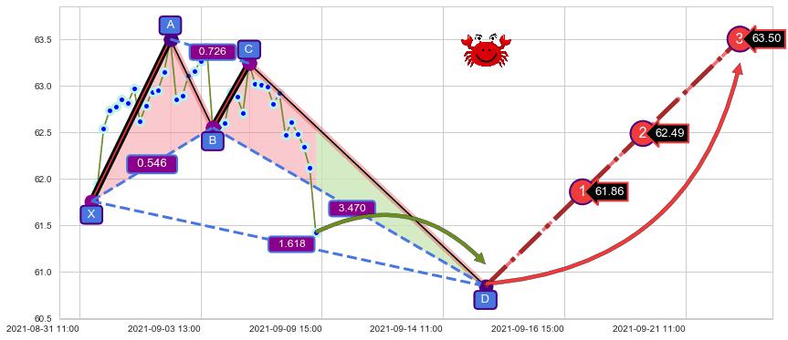 ➢ 距离预测D点位置尚有下跌空间,短线依然【看跌】, 耐心等待看涨【螃蟹】形态反转启动