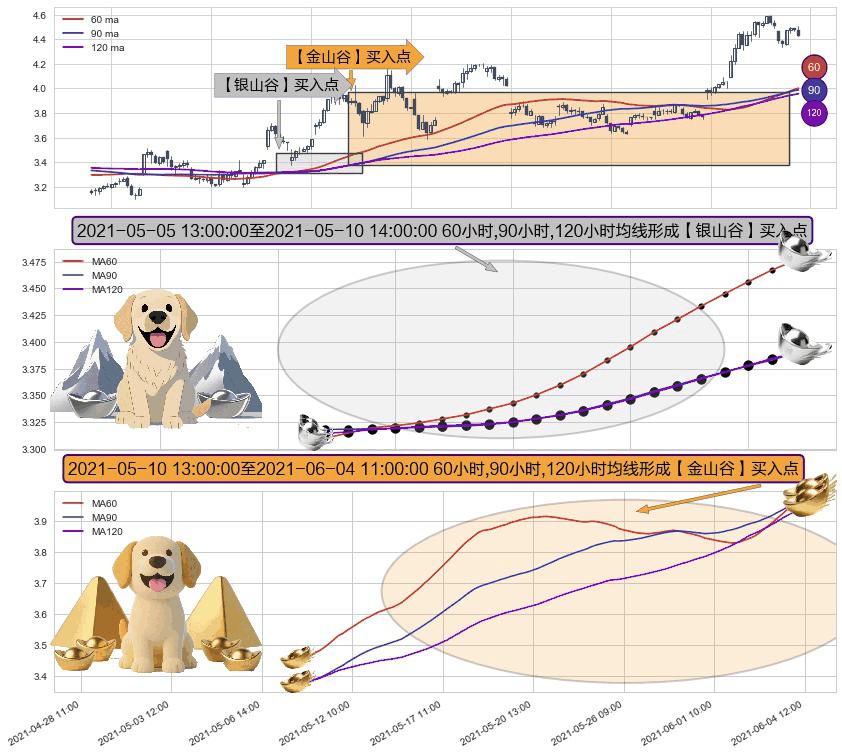 ⚀ 2021-05-10 14:00:00-小时至2021-06-04 11:00:00-小时显现 60小时-90小时-120小时均线 【金山谷】买入点 其再次确认了买入信号,可靠性更强,买入