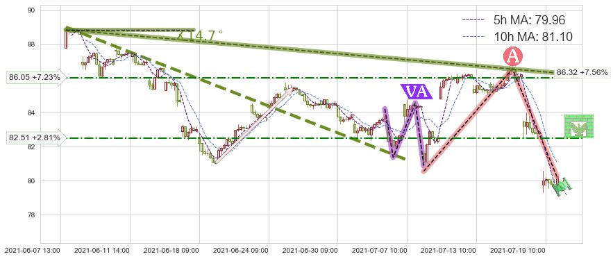 从2021-06-08 09:00至2021-07-19 14:00,共包含178个小时,阶段股价下跌-9.73%,阶段股价变动位移路程比: 1 : 7,下跌趋势角度: 14.7,2021-07-16 09:00向↘︎形成缺口,跳空下跌-3.51%˚