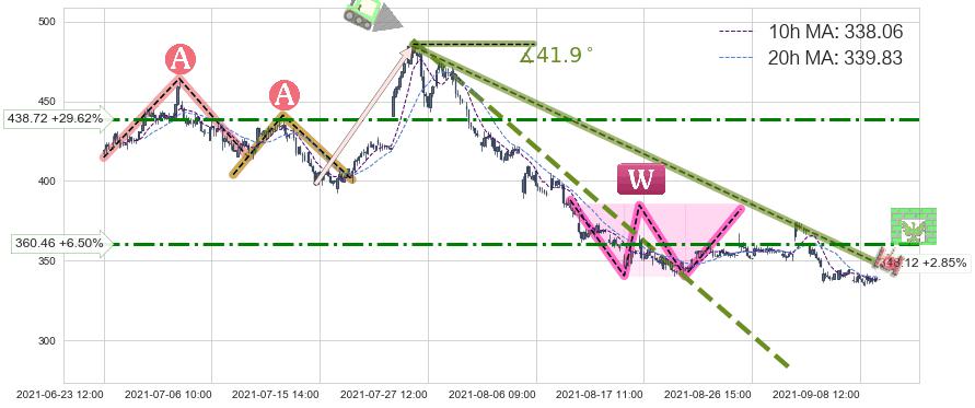 ♘ 阻力价格位360.46,可信任强度68.34%,距离最后交易2021-09-09 15:00形成的收盘价格338.46相差 +6.50%
