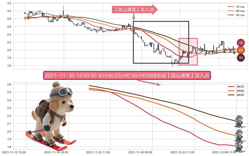 ⚀ 2021-11-19 11:00:00小时-2021-12-08 11:00:00小时显现 30小时-60小时-90小时均线 【高山滑雪】买入点 看多信号,后市看涨,买入