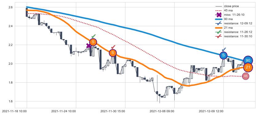 ⚂ 2021-12-13 16:00:00-小时均线向上突破,2021-12-27 09:00:00-小时重新下穿均线破位,均线阻力再次生效