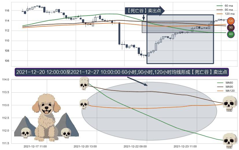形态多维评估: ⚀ 2021-12-20 13:00:00-小时至2021-12-27 10:00:00-小时显现 60小时-90小时-120小时均线 【死亡谷】卖出点 看空信号,后市看跌,卖出