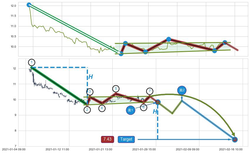 ➣ 【阻力】连续作用在→【③⑤⑦】形成上阻力震荡平行线