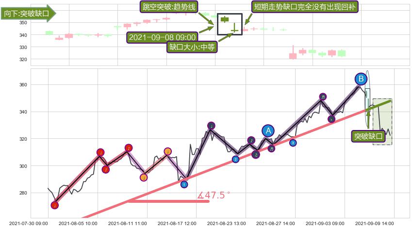 ➣ 2021-07-30 13:00-2021-09-07 14:00上升趋势存在反转[风险],其原上升趋势的支撑位(347.74)已破位[强阻力信号],原上升趋势角度: 47.5˚
