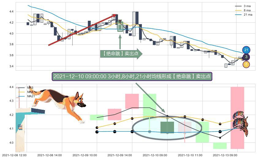 形态多维评估: ⚀ 2021-12-10 09:00:00小时显现 3小时-8小时-21小时均线 【绝命跳】卖出点 看空信号,后市看跌,卖出